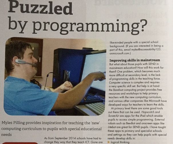 This month’s nasen special magazine features an article by me on the new computing curriculum and tools to use for developing Computer Programming for SEN and Severe and Complex needs. The article is titled “Puzzled by Programming?”