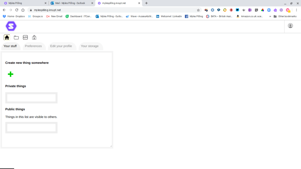 So how can I describe SOLID? It feels like a wiki and yet it’s a personal cloud storage area. There are contacts lists, folders, files, documents. A place to store things. A place to share things. Public and private. It feels very, very basic and geeky with areas where code is listed for your site – presumably to share with others what you have built.