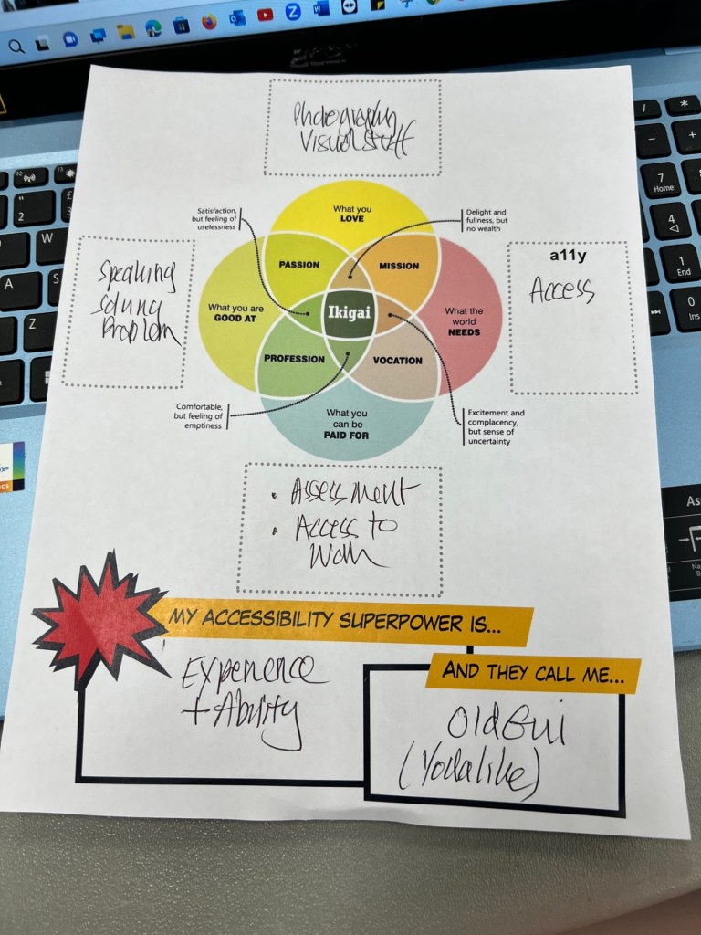 Great presentation by Erin Lucas of Microsoft. It’s about our Accessibility Superpower based on a Japanese philosophy called Ikigai. Here is my Supowerpower chart and my Superhero name ” OldGui” Pronounced “Old Guy” Yodalike so ” Awesome is he. Accessible is he”