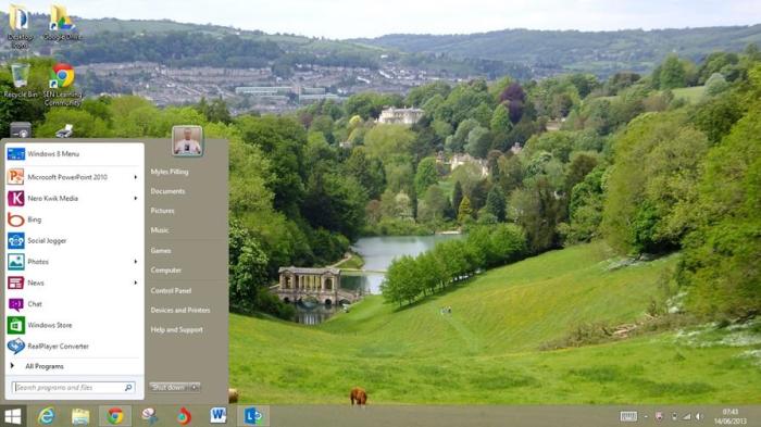 If you are using a Windows 8 machine and miss the menu and search windows then try this program which places a windows icon at the bottom of the screen to reveal the old familiar menu. I have been trying it out and it seems stable. It is a small cost $3.99 but worth every penny as I hate having to switch windows view to find an applications. It’s not fast Microsoft to do it that way! Call me stuck in my ways but this is really useful. I’ve attached an image to show what it looks like below. Thanks to Bob Harding for finding this!